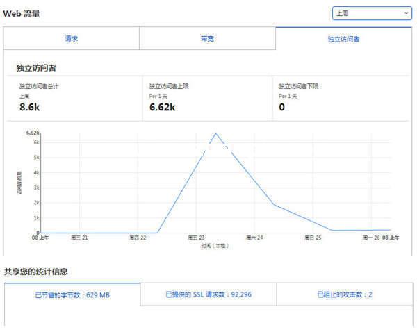 之后也在不斷的尋找辦法,緊要的還是想把討厭的DDOS解決掉,因為是小白級,解決起來也挺費勁,上班時間也不多。后來網上看說CDN管用,于是東找西找終于找到了免費的CDN,有DDOS防護功能。7月22日上了CDN,從監控數據中看到,每日的獨立訪問ip幾千個,阻止攻擊數2次。終于在7月25日,DDOS停止了,百度統計中的數據也正常了。我不知道是不是CDN起了作用。