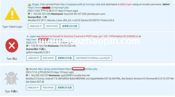 同時,在CDN之前,我在網站后臺也使用了免費的網站安全插件,在相關的統計數據中,我看到了更多的問題,除了DDOS,還有人在不斷的嘗試登陸我的后臺,已經其他一些我看不懂的各種操作。我是WordPress搭建的博客,以前默認使用用戶名admin登陸,對方使用admin以及其他用戶名在不停的嘗試登陸,或許在嘗試破解密碼,我設置了登陸失敗封禁IP等等,另外還改了用戶名,并且增加了雙因素驗證登陸;另外插件也阻止了一些搜索詞的訪問;還有訪問xmlpc.php,網上看這個文件也有相關的攻擊方法,于是也刪掉了。
