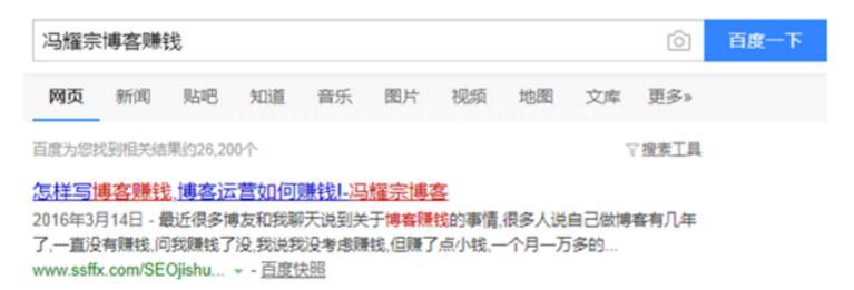 那么不加上雙引號匹配搜索,可以搜索出來2萬條結果,可以從標題中看到,博客賺錢和馮耀宗博客是分開的,所以關鍵詞并非完整關鍵詞。