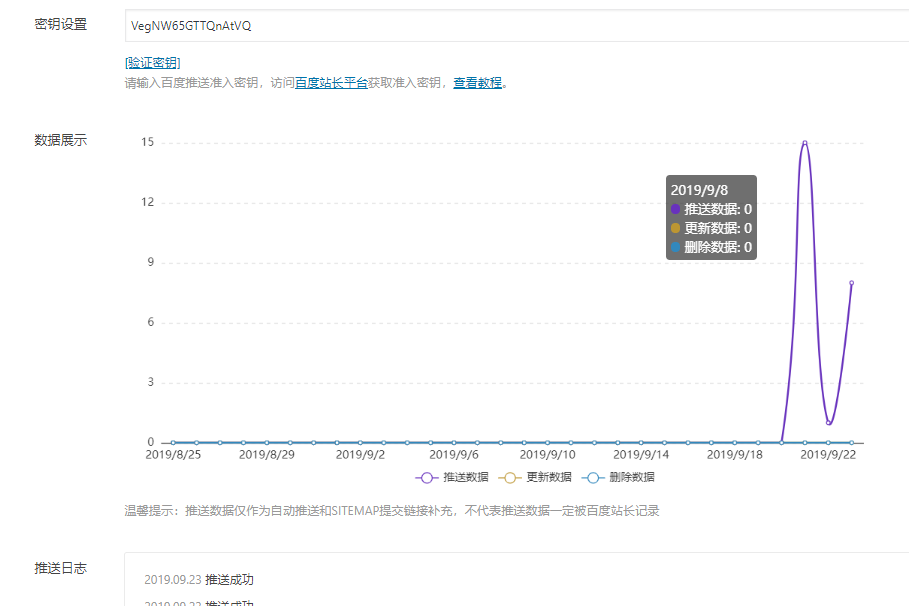 主動推送-支持博主通過配置百度主動推送準入密鑰,主動向Baidu提交網站新增、更新和刪除內容URL。并且可查看最近三十天的推送數據及推送錯誤日志。