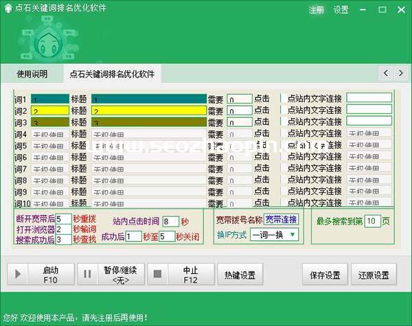 打開(kāi)點(diǎn)石關(guān)鍵詞排名優(yōu)化軟件,添加需要提高排名的關(guān)鍵詞、需要提高排名的網(wǎng)站或域名、站內(nèi)二次點(diǎn)擊文字或鏈接,并可根據(jù)自己的寬帶速度設(shè)置點(diǎn)擊時(shí)間。
